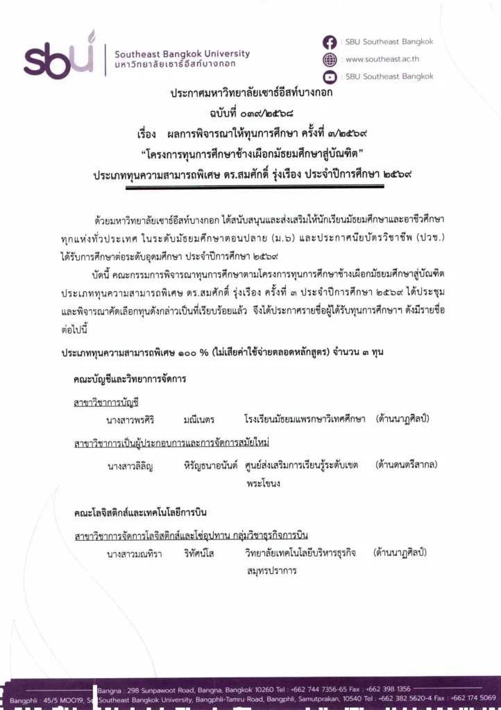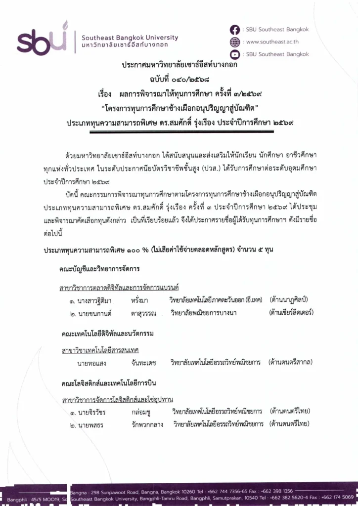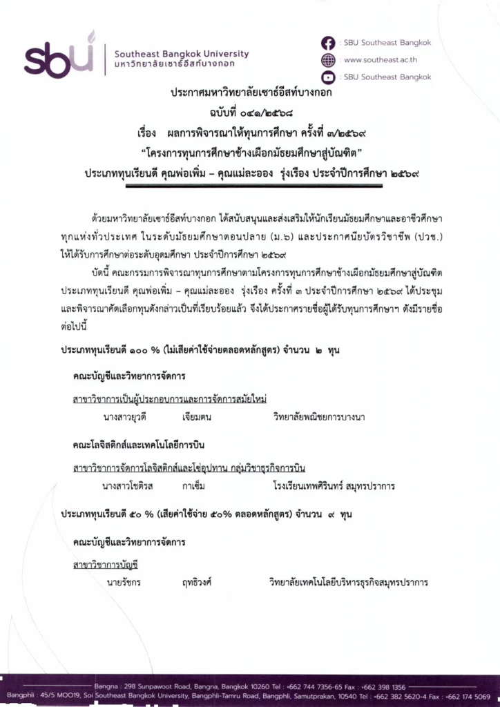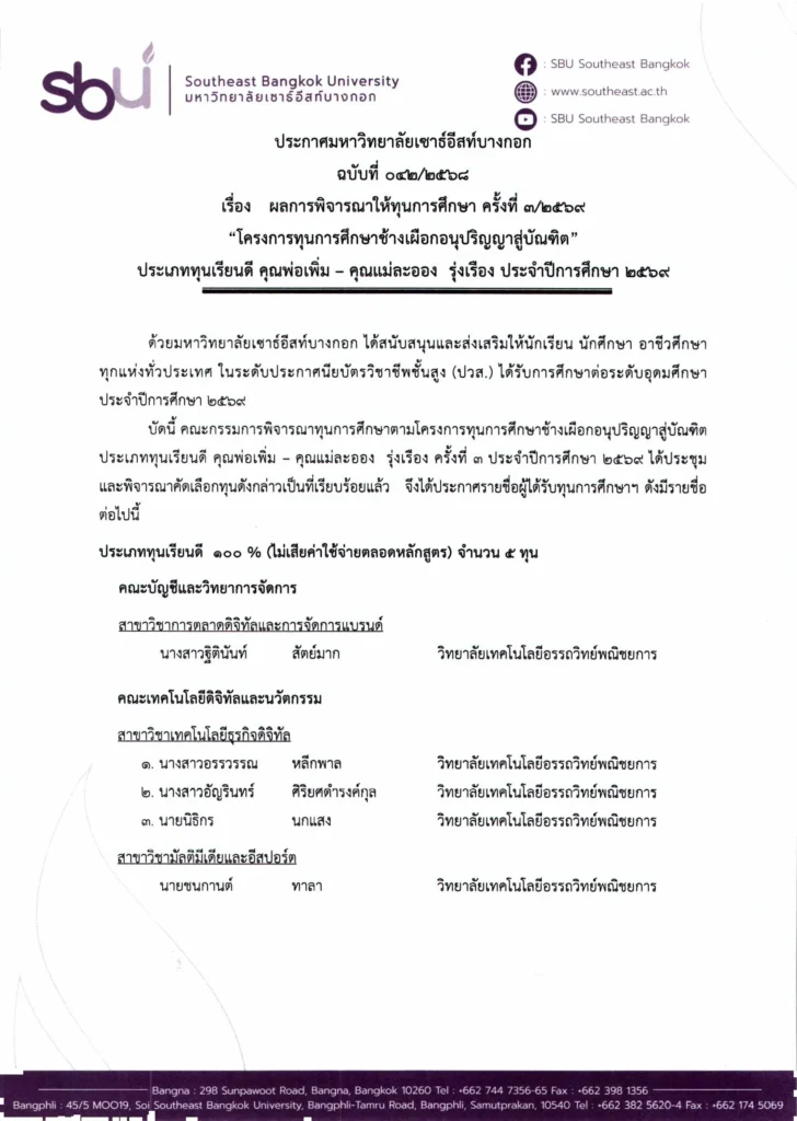 ประกาศผลการพิจารณาทุนการศึกษา ครั้งที่ 3 ปีการศึกษา 2569
