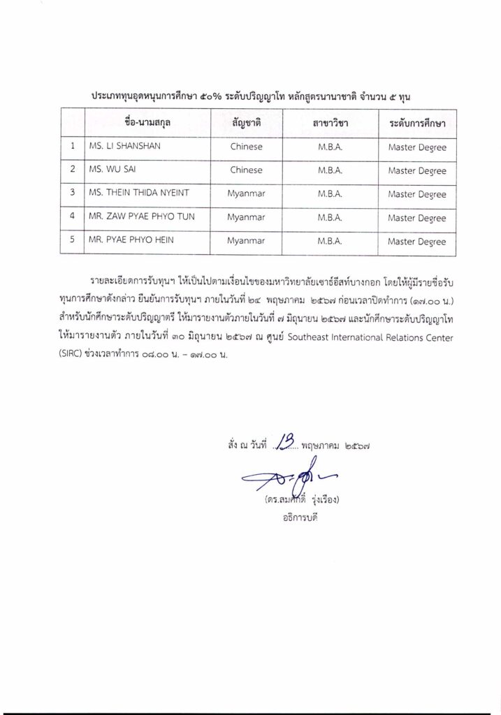 To whom in the list, please confirm your admission of scholarship by 24 May 2024 for Bachelor Degree and by 30 June 2024 for Master Degree within office hours 08:00 – 17:00 hrs at Southeast International Relations Center (SIRC) Ground Floor at Administration Building (Building 3).