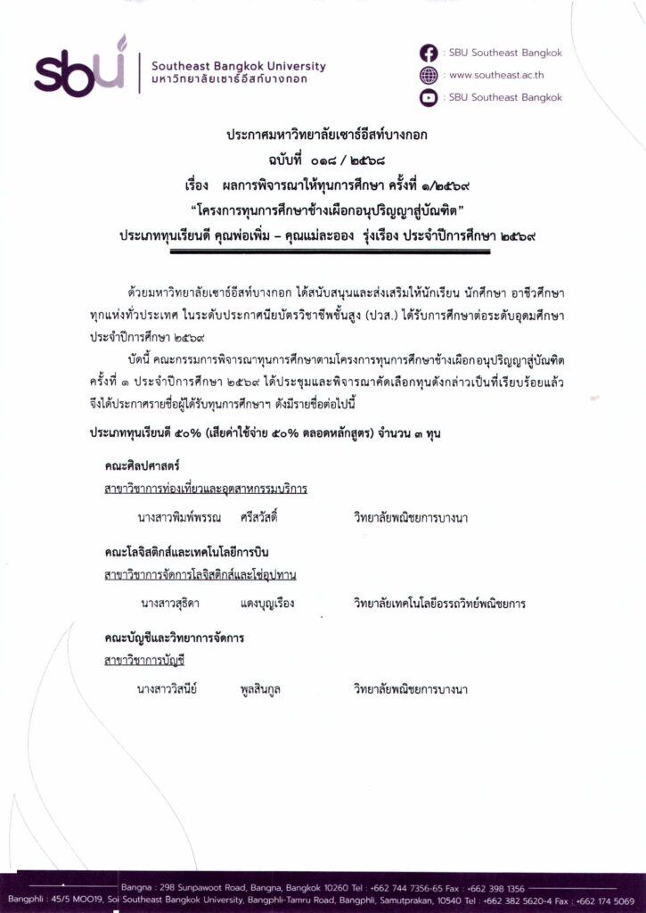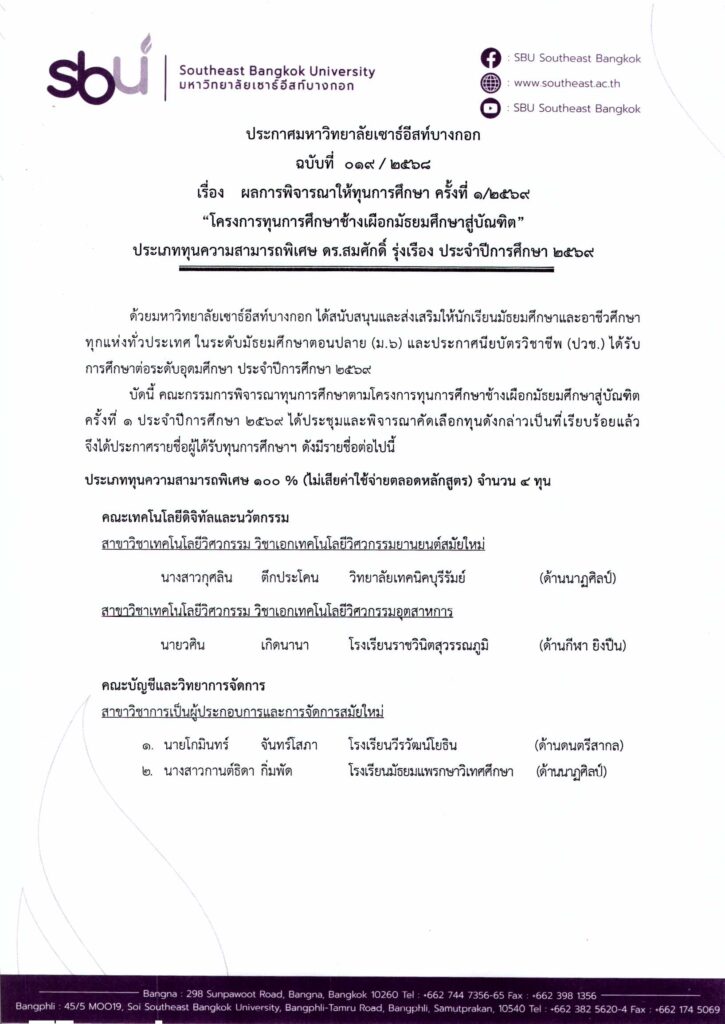 ประกาศผลการพิจารณาทุนการศึกษา ครั้งที่ 1 ปีการศึกษา 2569 ประกาศผลการพิจารณาทุนการศึกษา โครงการทุนช้างเผือกฯ ครั้งที่ 1 ปีการศึกษา 2569 ติดตาม คอนเท้นดีๆเพิ่มเติมได้ที่ Facebook TikTok YouTube Instagram 281 Tags# Dek68# deksoutheast# sbu# SoutheastBangkokUniversity# SoutheastProfessional# มหาวิทยาลัยเซาธ์อีสท์บางกอก